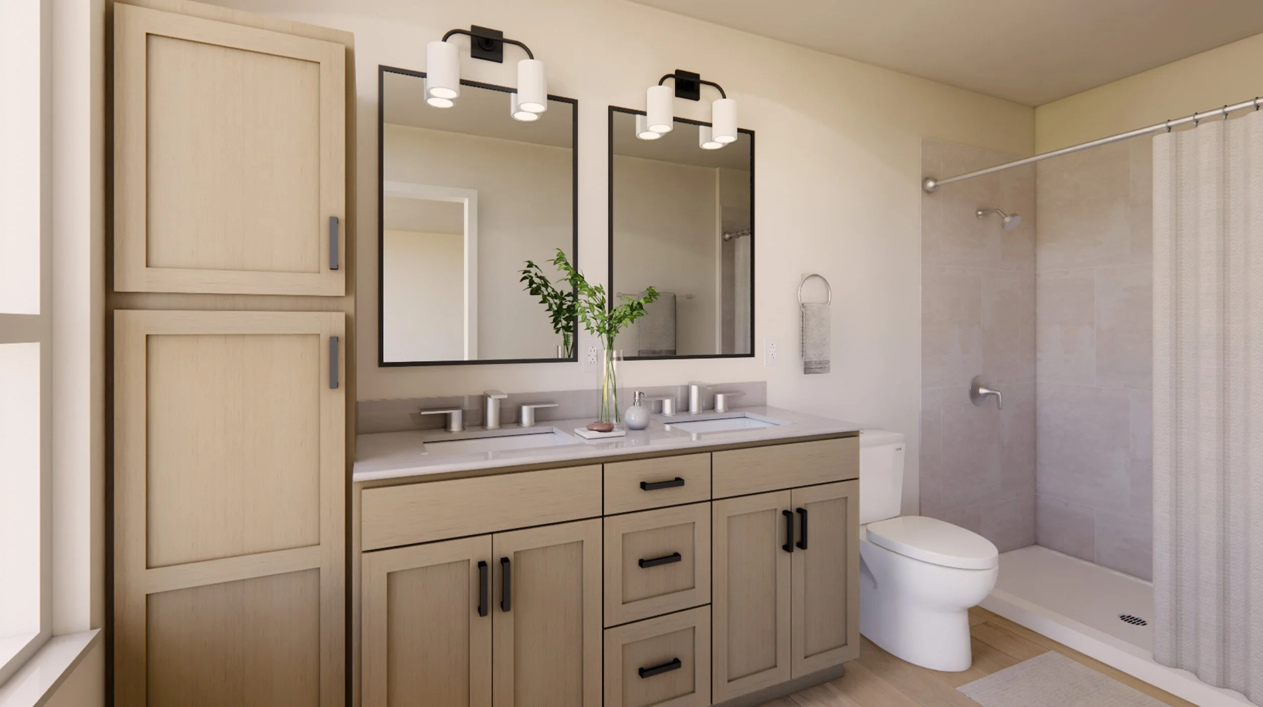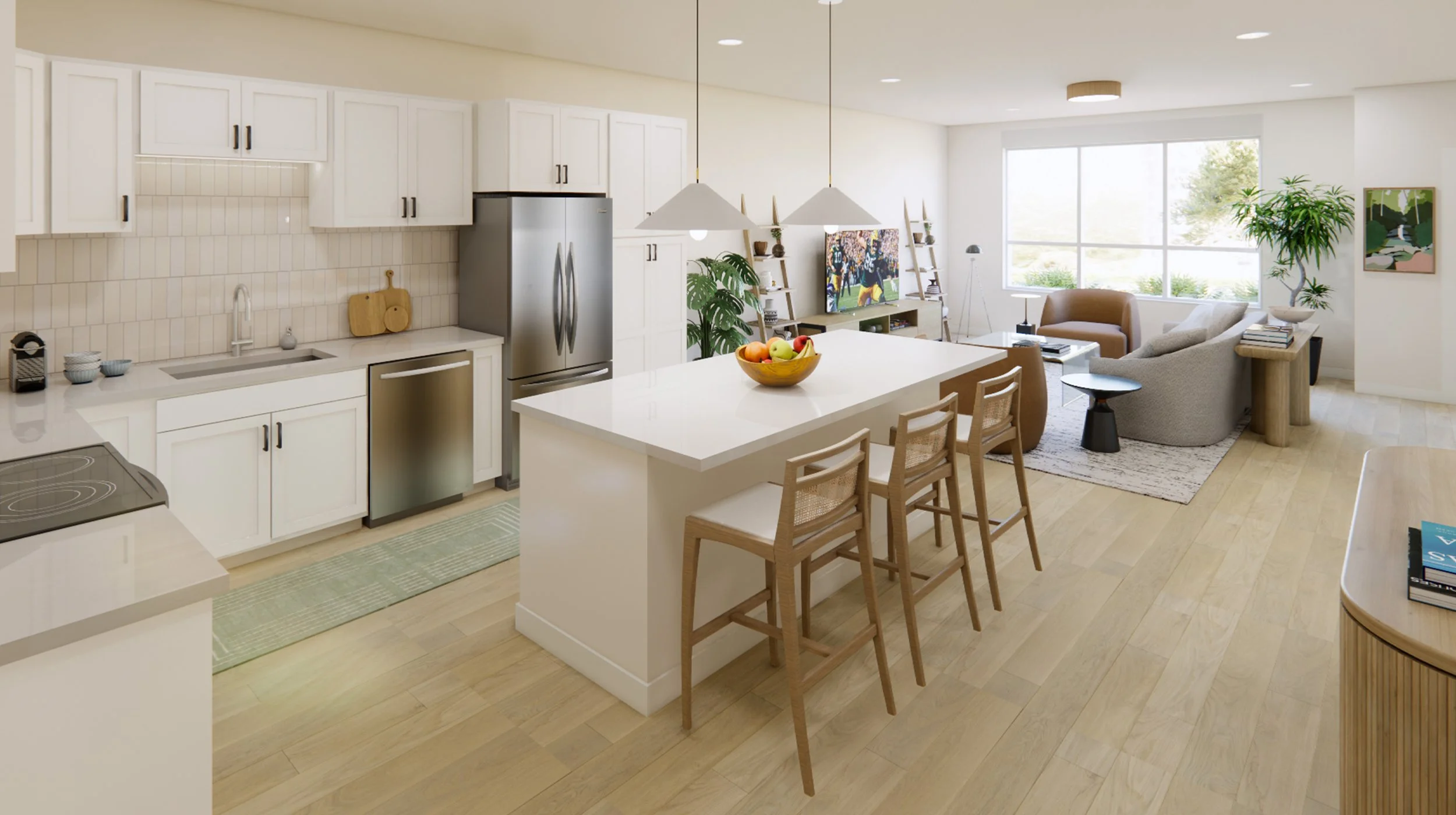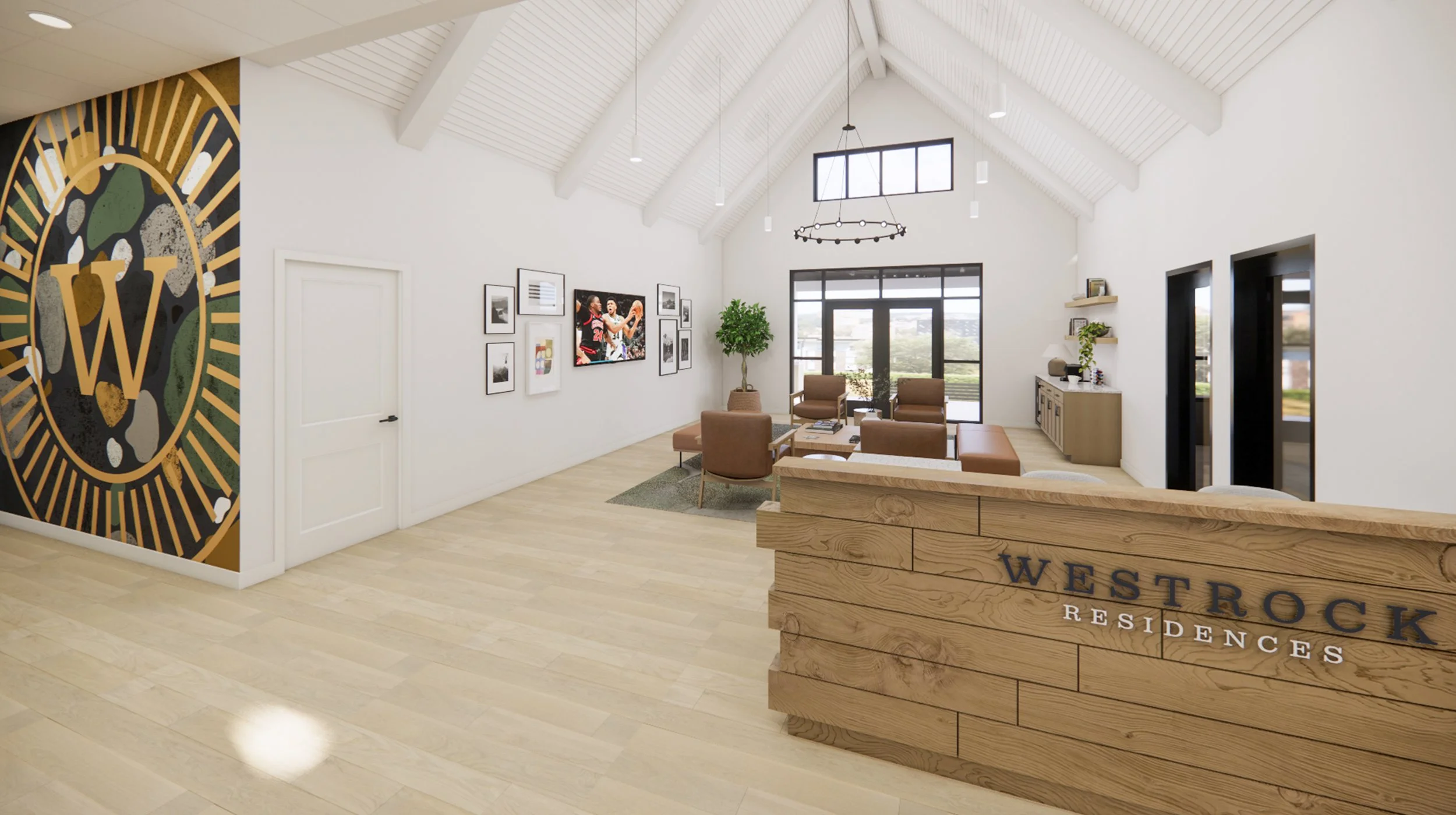 Interiors echo a modern farmhouse style featuring warm wood tones balanced by crisp black and white accents throughout the residential buildings. The clubhouse reflects a broader expression of the brand identity with custom graphic wallcovering, colored accent tile and nature-inspired artwork.